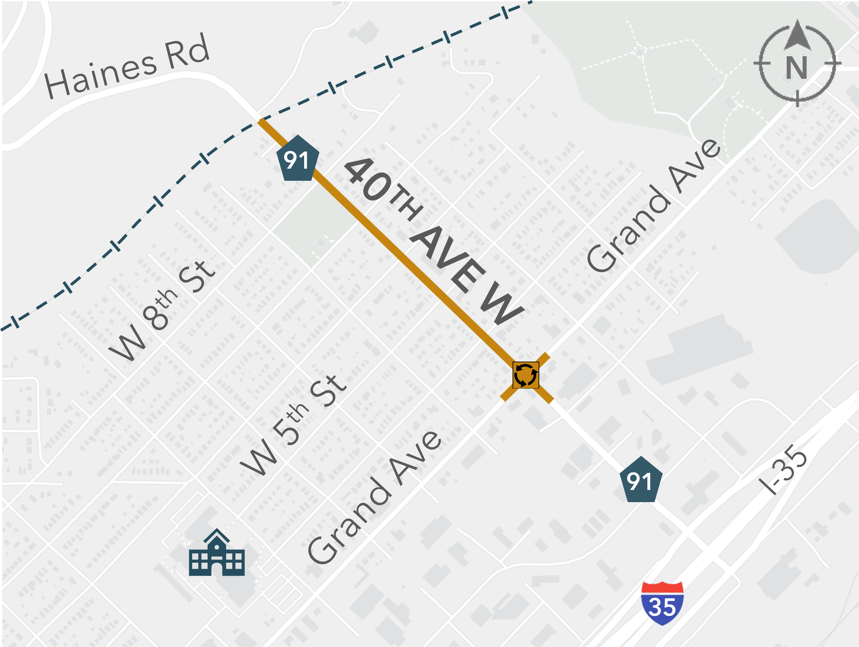 - Construct a raised center median along 40th Ave West beginning at Grand Ave and ending at 8th St. Openings in the median will be provided at intersections and alleys.