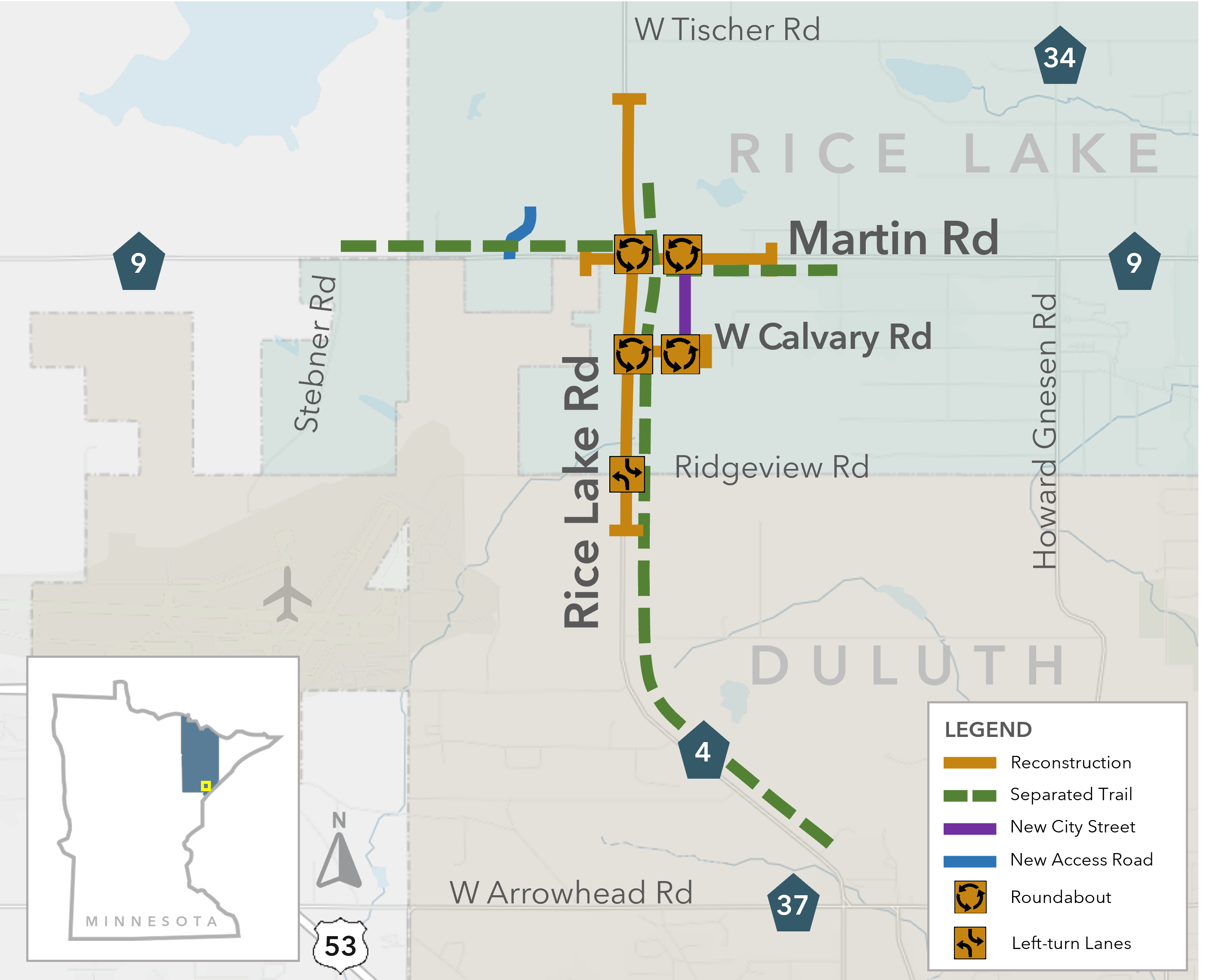 St. Louis County, in partnership with the City of Rice Lake, is developing the Rice Lake Rd Corridor Project. This is a transformational project that will improve traffic operations and safety and create new walking and biking opportunities while also supporting existing and new opportunities for community development. In 2024, the County was awarded a grant, as well as other matching federal and state funds to complete the project. With appropriate funding in place, the County is taking the next steps to bring this project to reality. Stakeholder meetings held in 2023 helped shape a conceptual solution on how to resolve the issues brought forth during community engagement. When completed, this project will create a new gateway to the City of Rice Lake.